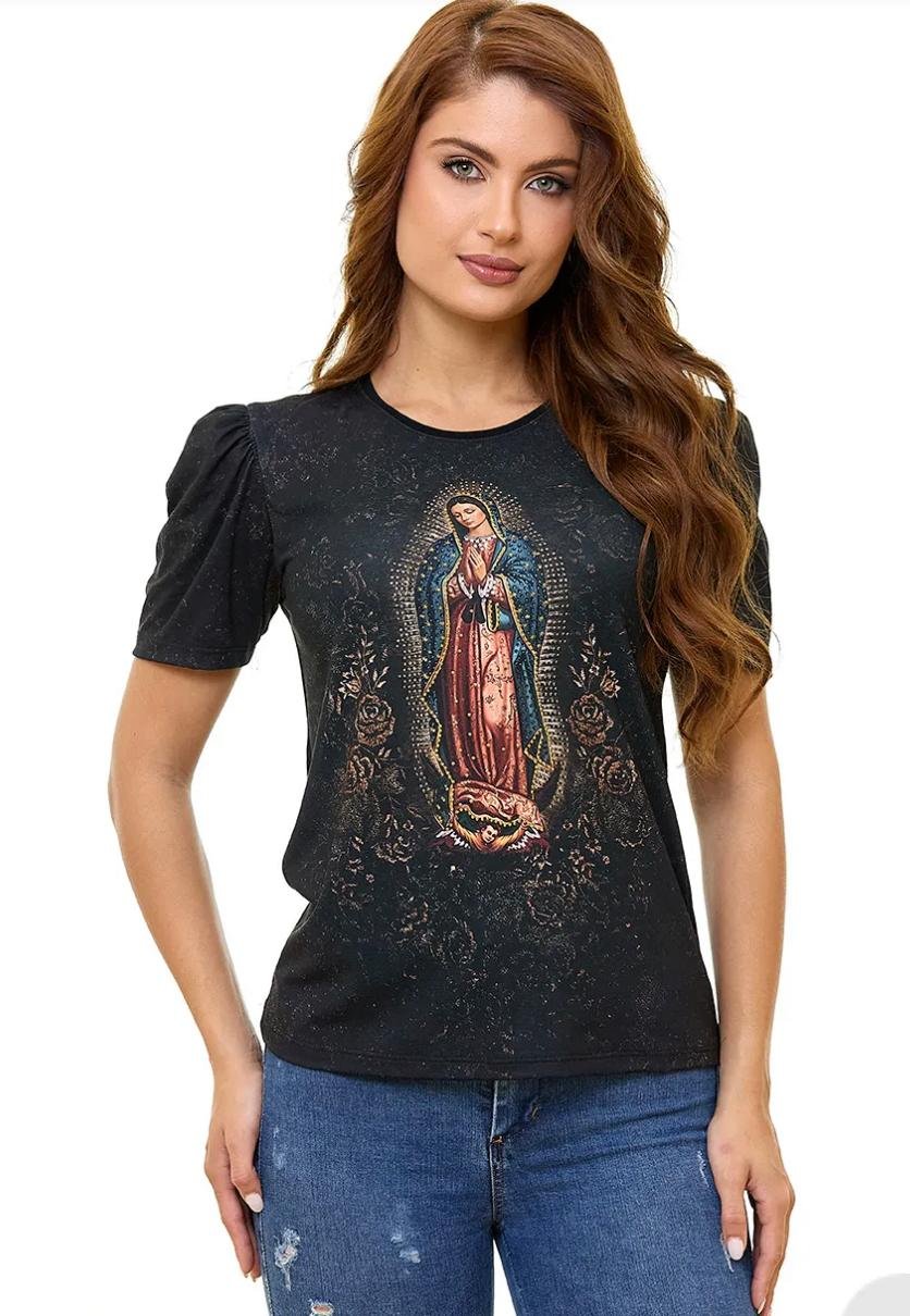 Baby look Ágape “Nossa Senhora de Guadalupe” , em viscolycra, bordada com pedrinhas de strass.