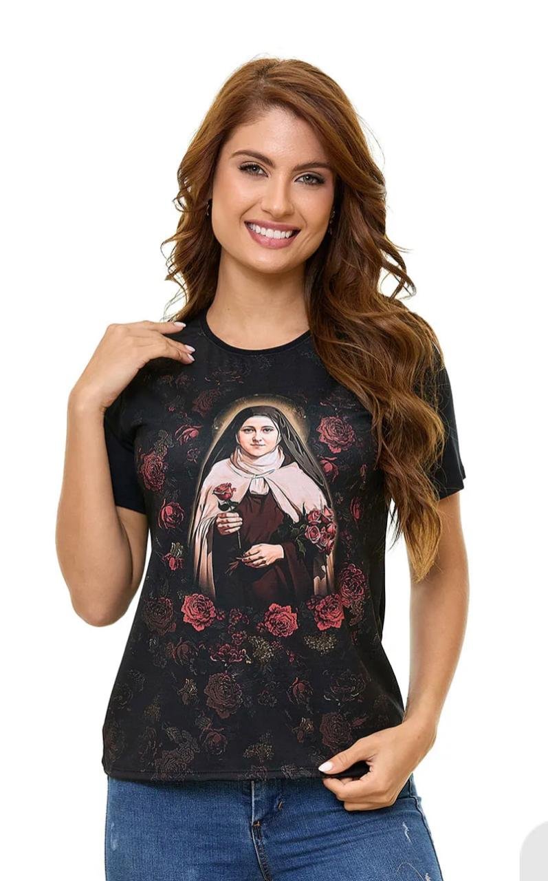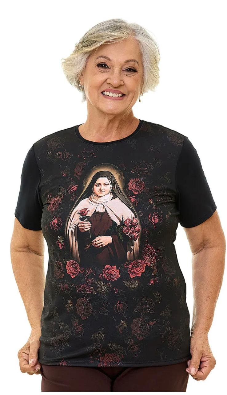 Baby look Ágape “Santa Terezinha”. Em viscolycra.