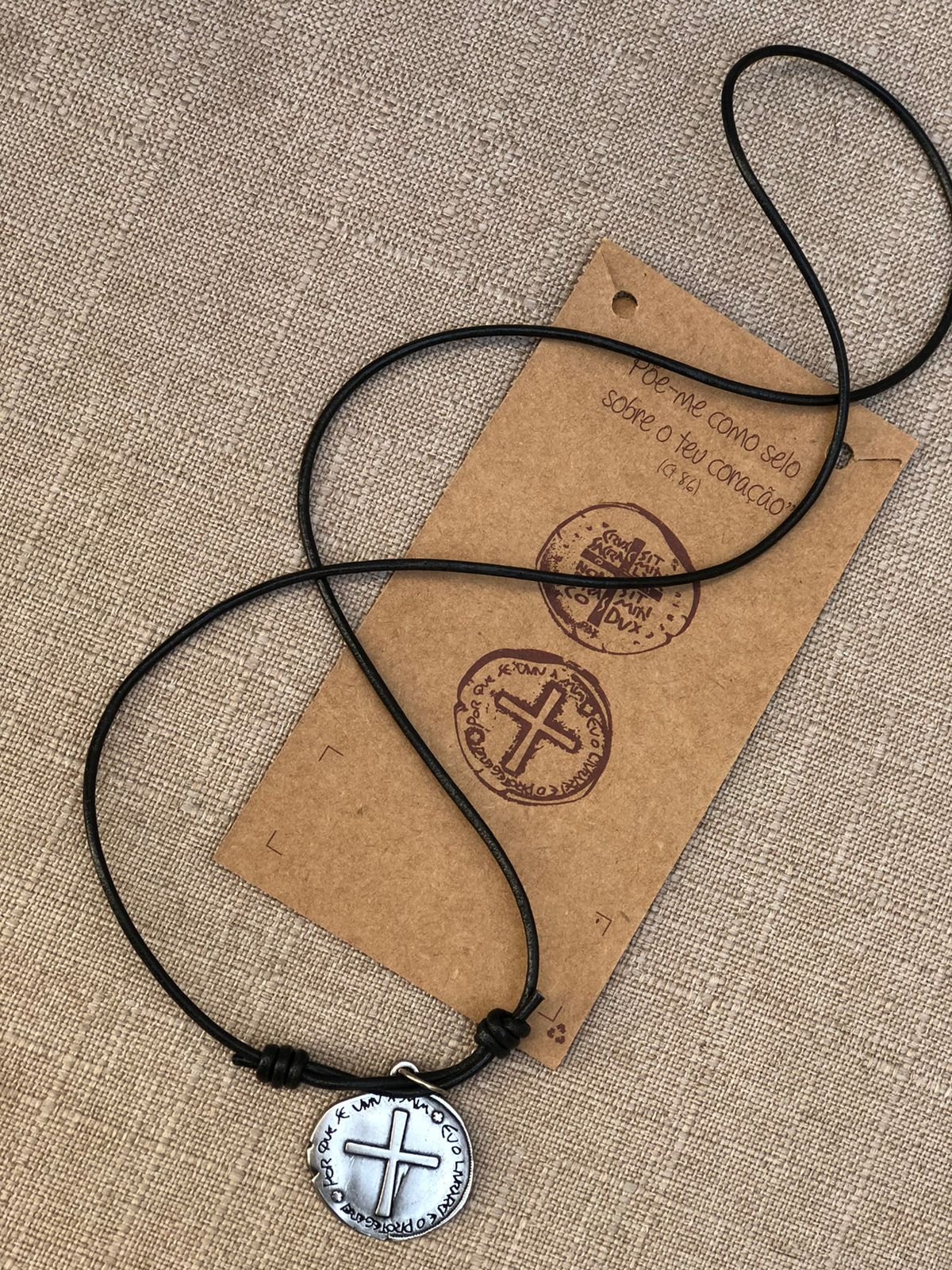 Cordão em couro preto. Medalha em prata envelhecida. Medalha 2,8 cm.